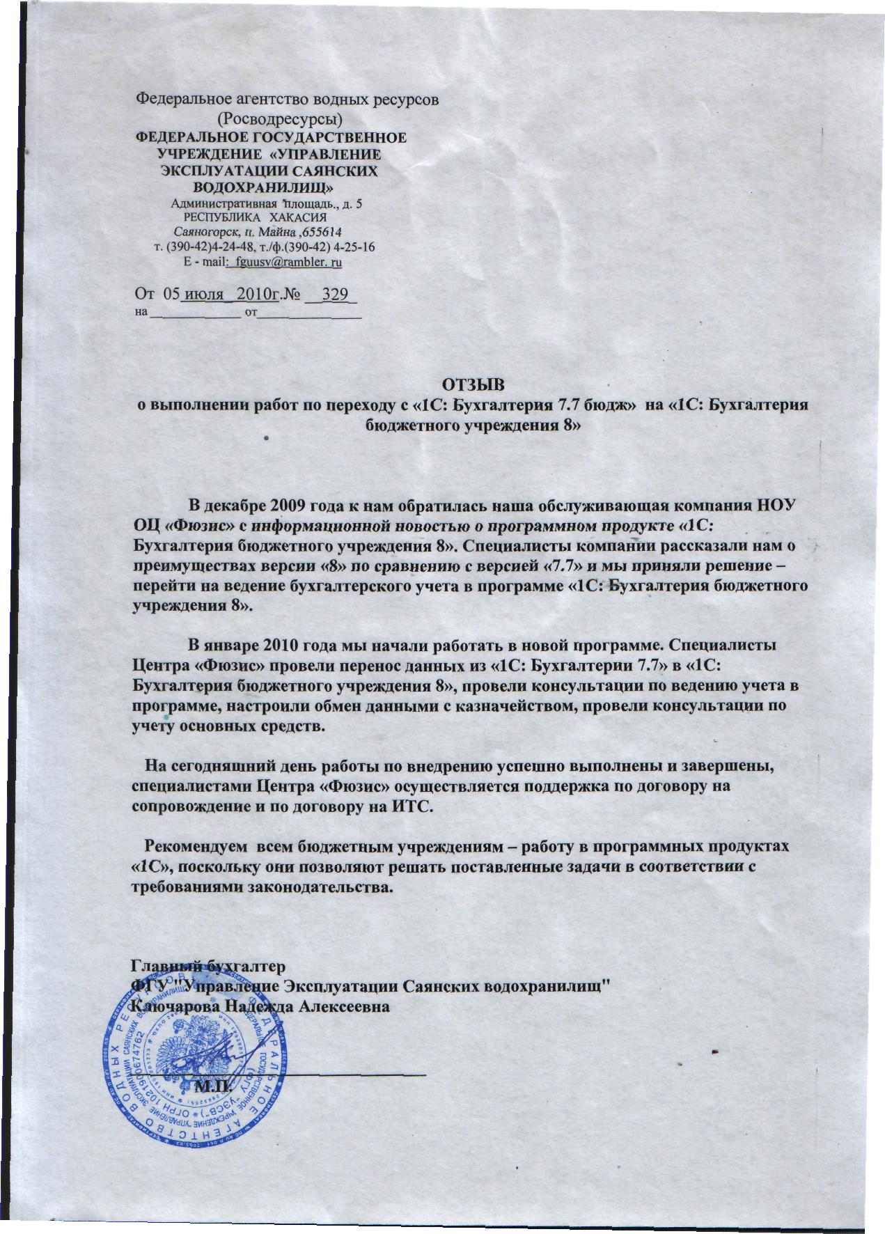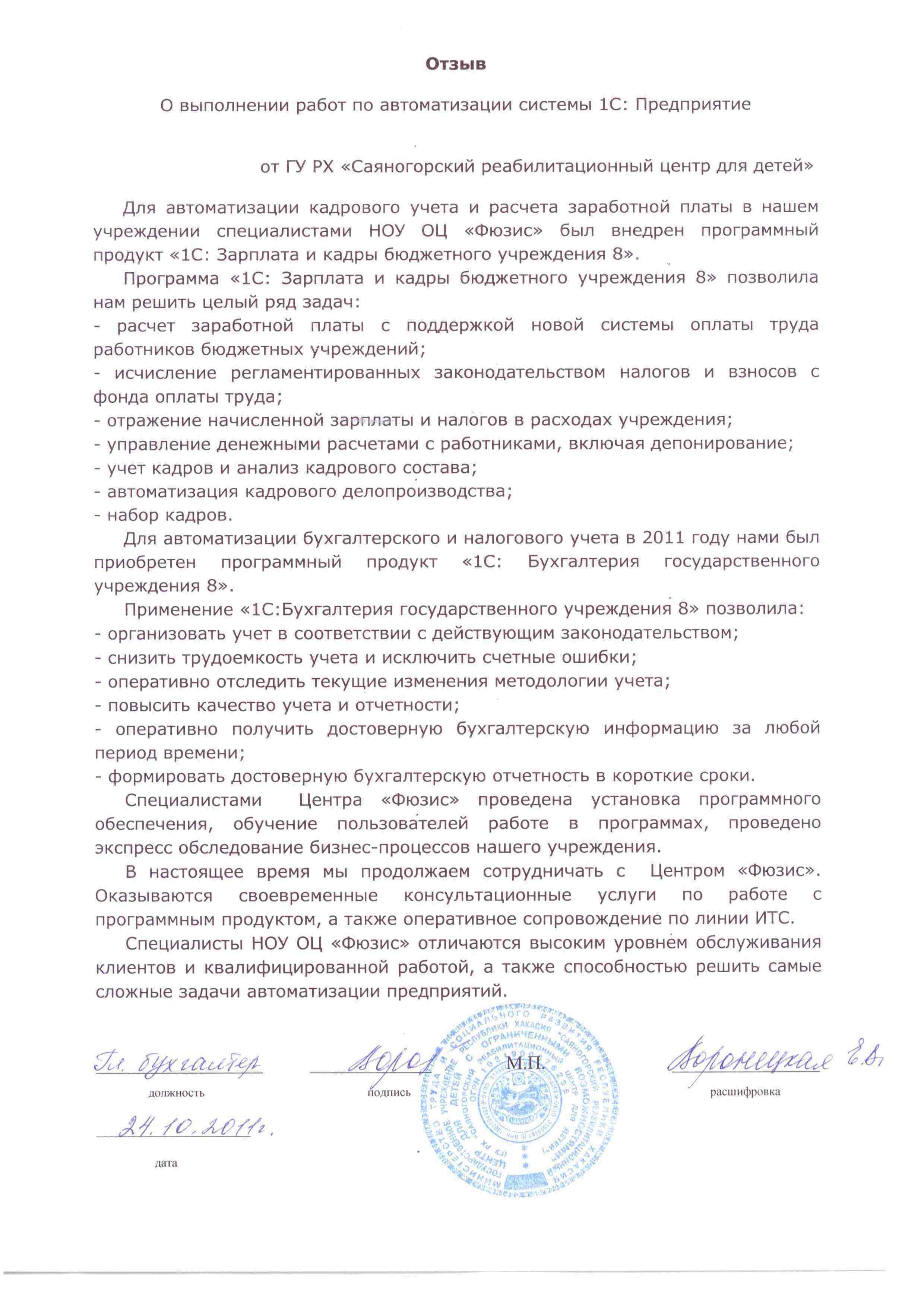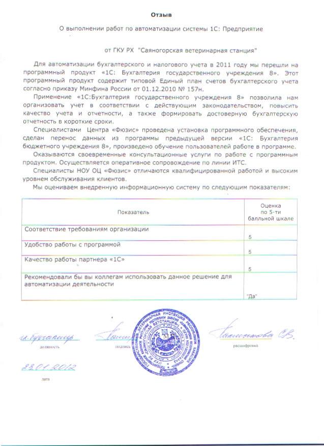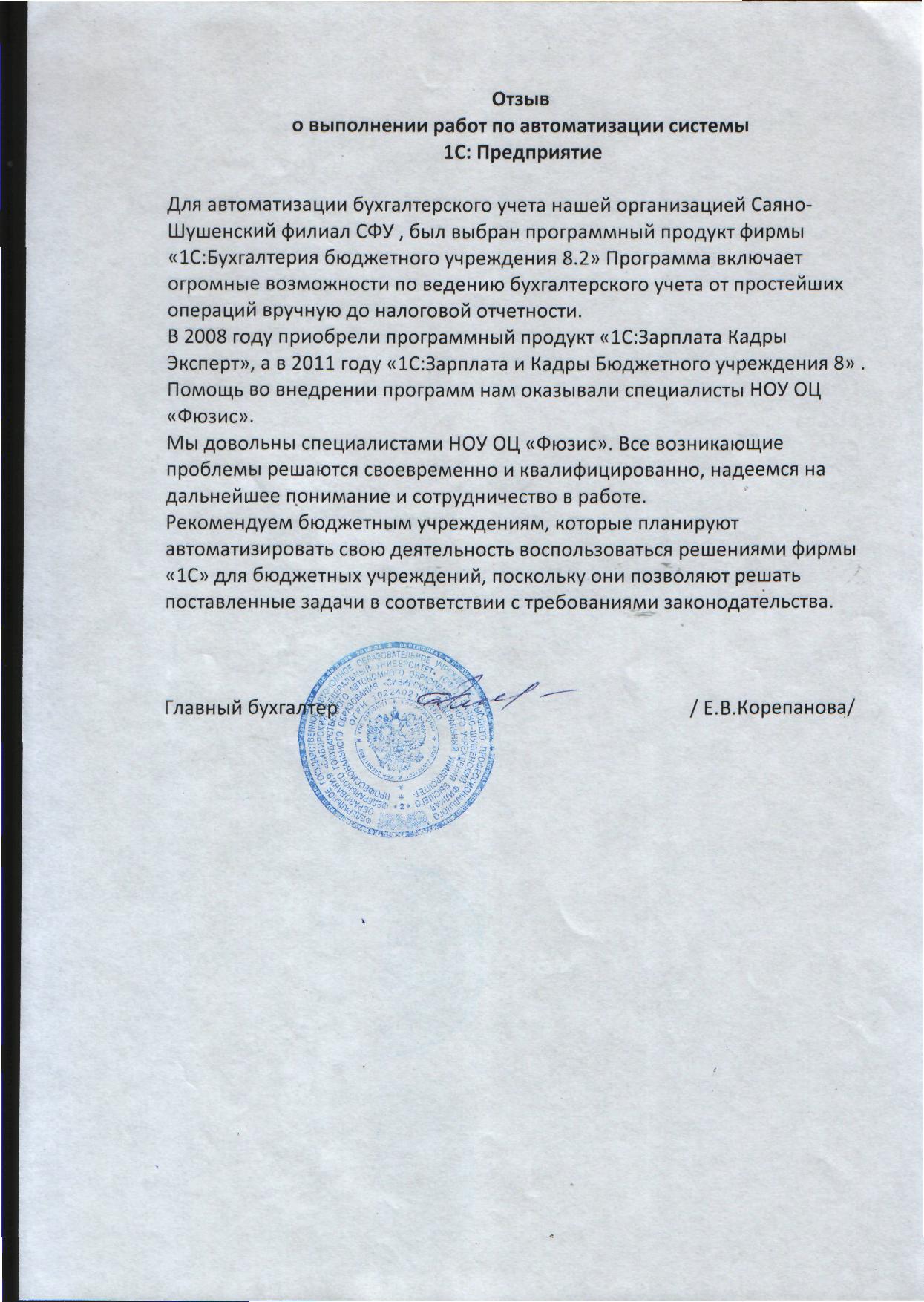 Помощь во внедрении программ нам оказывали специалисты НОУ ОЦ "Фюзис". Мы довольны специалистами НОУ ОЦ "Фюзис". Все возникающие проблемы решаются своевременно и квалифицированно, надеемся на дальнейшее понимание и сотрудничество в работе. Рекомендуем бюджетным учреждениям, которые планируют автоматизировать свою деятельность воспользоваться решениями фирмы "1С" для бюджетных учреждений, поскольку они позволяют решать поставленные задачи в соответствии с требованиями законодательства.