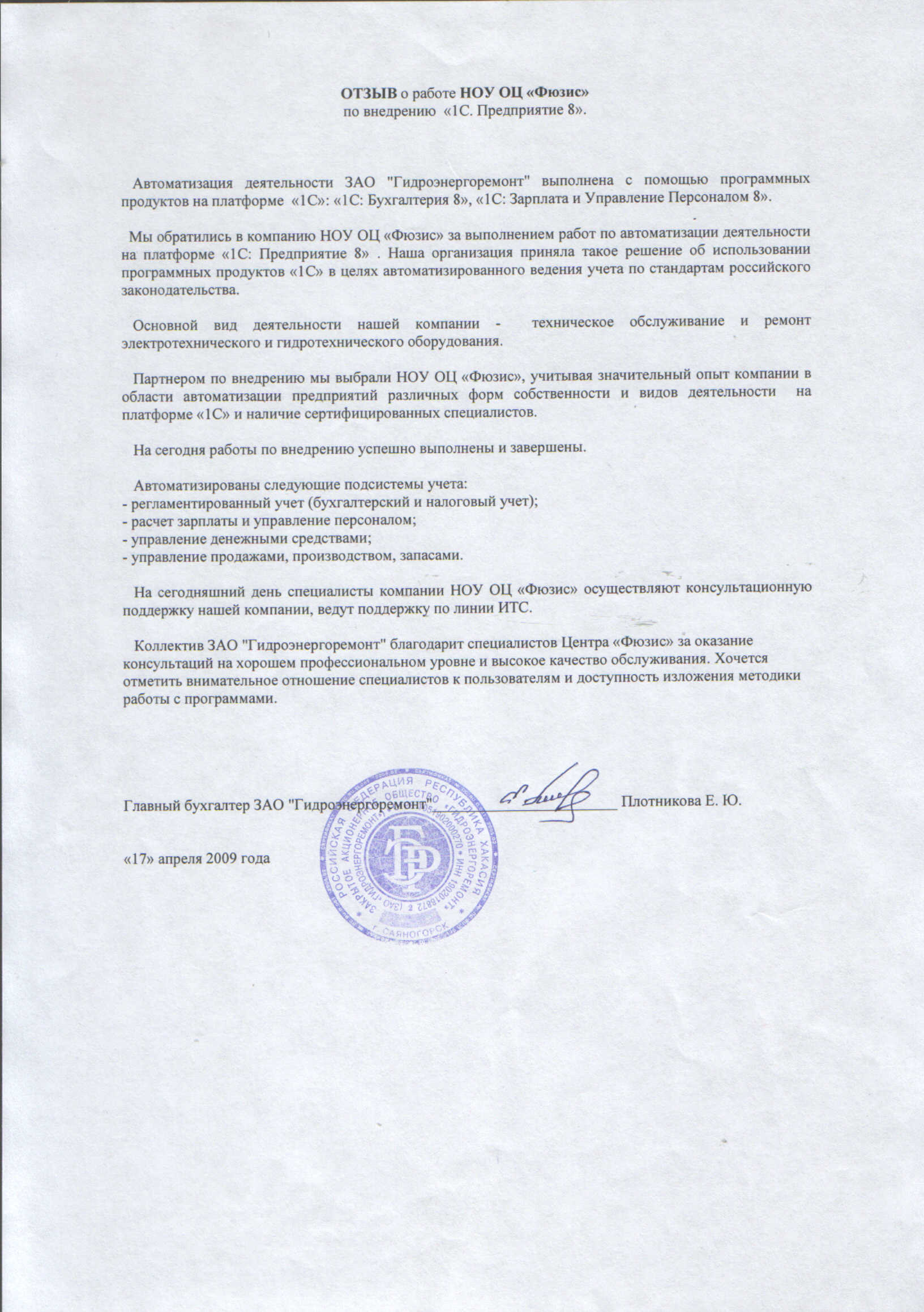 На сегодняшний день специалисты компании НОУ ОЦ "Фюзис" осуществляют консультационную поддержку нашей компании, ведут поддержку по линии ИТС. Коллектив ЗАО "Гидроэнергоремонт" благодарит специалистов Центра "Фюзис" за оказание консультаций на хорошем профессиональном уровне и высокое качество обслуживания. Хочется отметить внимательное отношение специалистов к пользователям и доступность изложения методики работы с программами.