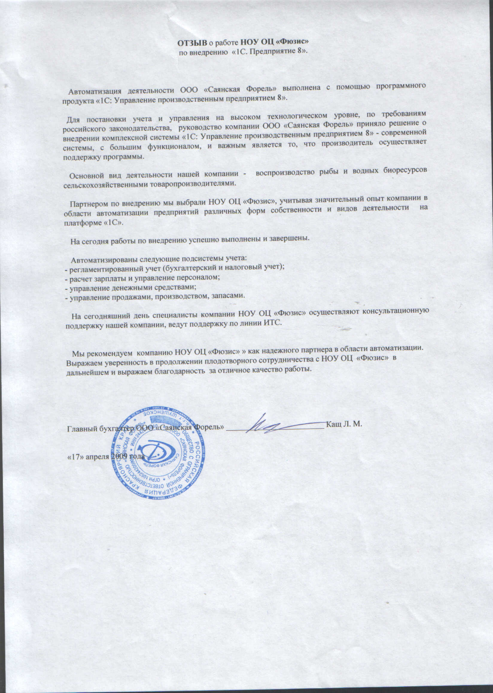 Работы по внедрению выполнены успешно и завершены. Автоматизированы следующие подсистемы учёта: регламентированный учёт (бухгалтерский и налоговый учёт), расчёт зарплаты и управление персоналом, управление денежными средствами, управление продажами, производством, запасами. На сегодняшний день специалисты компании НОУ ОЦ "Фюзис" осуществляют консультационную поддержку нашей компании, ведут поддержку по линии ИТС. Мы рекомендуем компанию НОУ ОЦ "Фюзис" как надежного партнера в области автоматизации. Выражаем уверенность в продолжении плодотворного сотрудничества с НОУ ОЦ "Фюзис" в дальнейшем и выражаем благодарность за отличное качество работы.