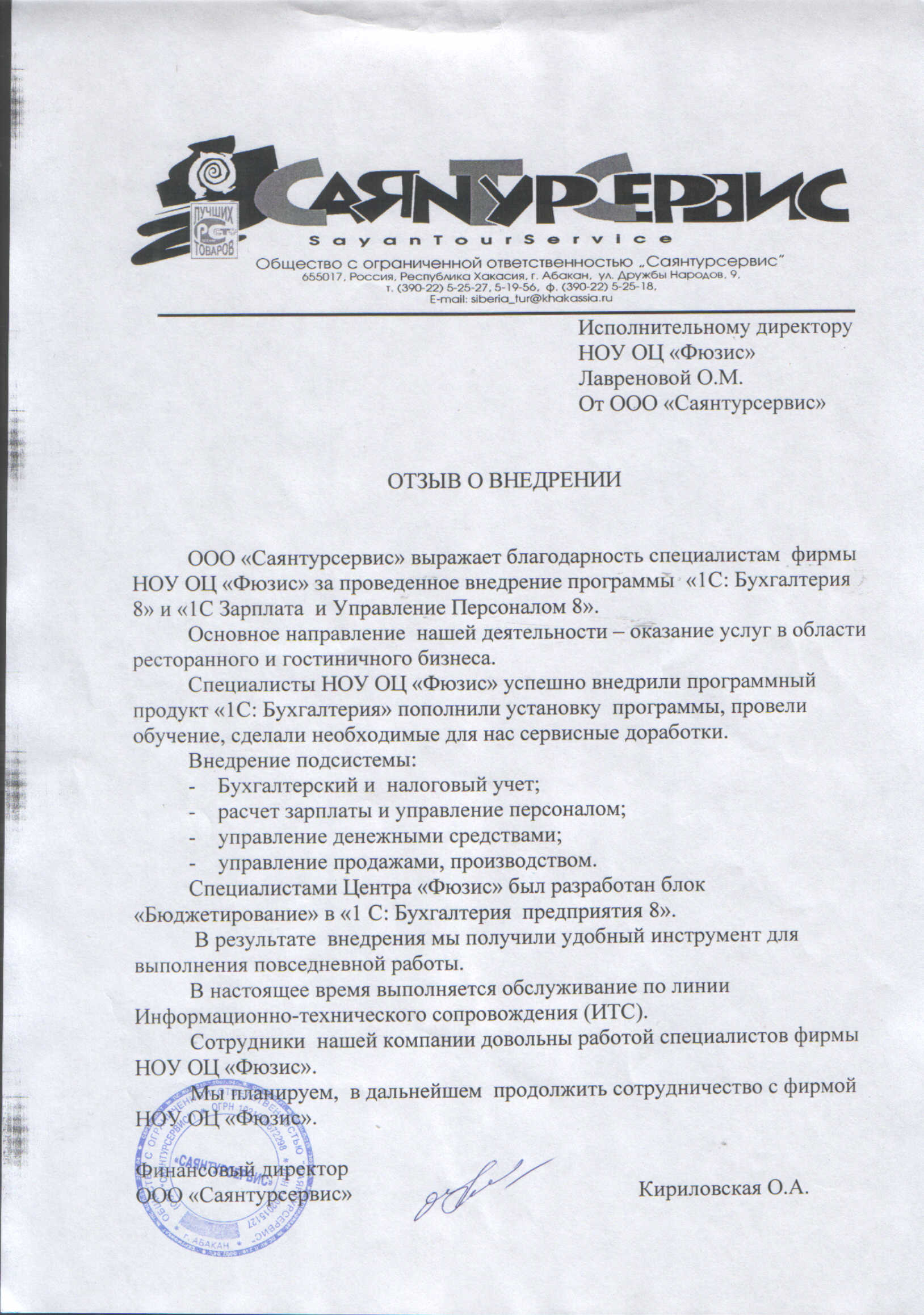 ООО "Саянтурсервис" выражает благодарность специалистам фирмы НОУ ОЦ "Фюзис" за проведенное внедрение программы "1С:Бухгалтерия 8" и "1С: Зарплата и Управление Персоналом 8". Основное направление нашей деятельности - оказание услуг в области ресторанного и гостиничного бизнеса. Специалисты НОУ ОЦ "Фюзис" успешно внедрили программный продукт "1С:Бухгалтерия" пополнили установку программы, провели обучение, сделали необходимые для нас сервисные доработки.