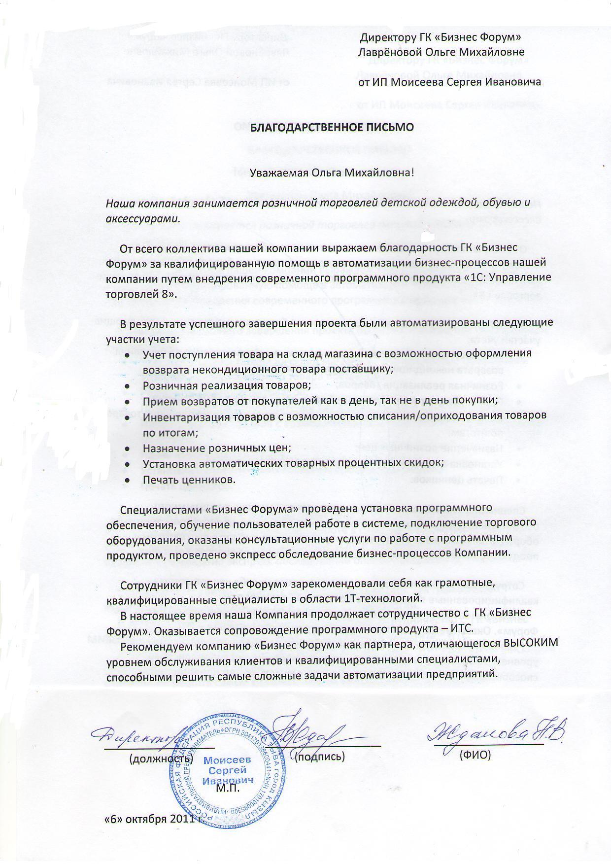 Уважаемая Ольга Михайловна! Наша компания занимается розничной торговлей детской одежды, обувью и аксессуарами. От всего коллектива нашей компании выражаем благодарность ГК "Бизнес Форум" за квалифицированную помощь в автоматизации бизнес-процессов нашей компании путем внедрения современного программного продукта "1С:Управление торговлей 8".