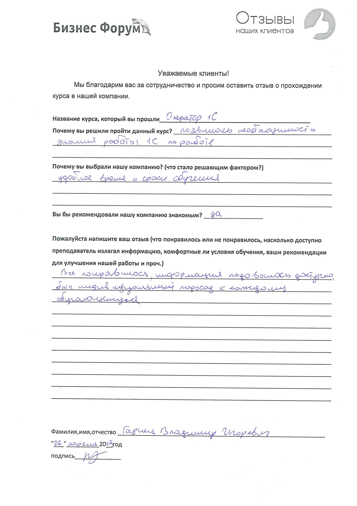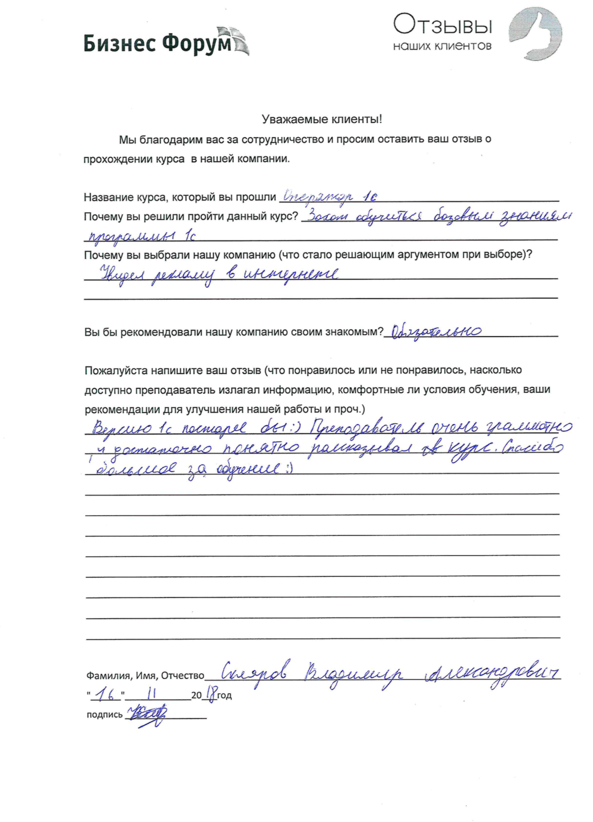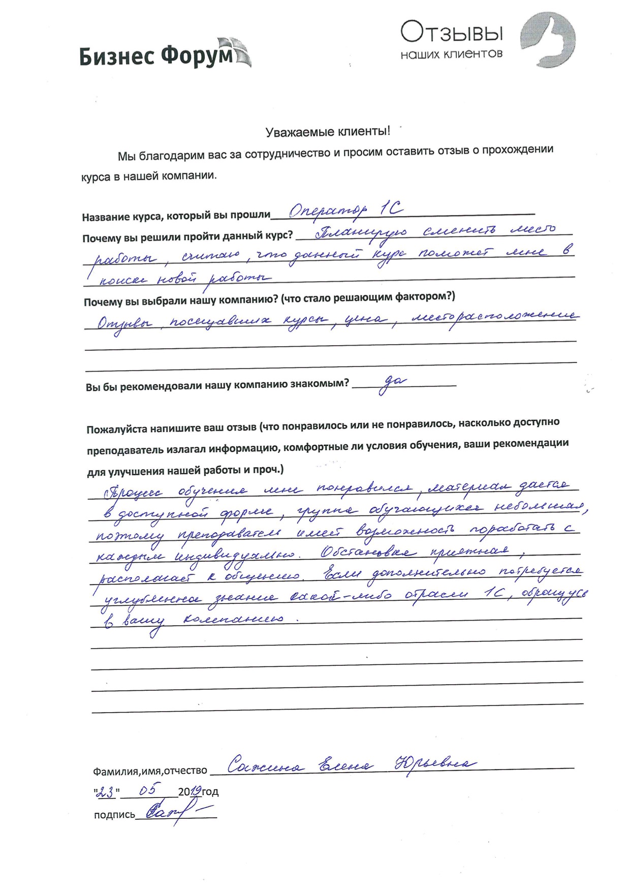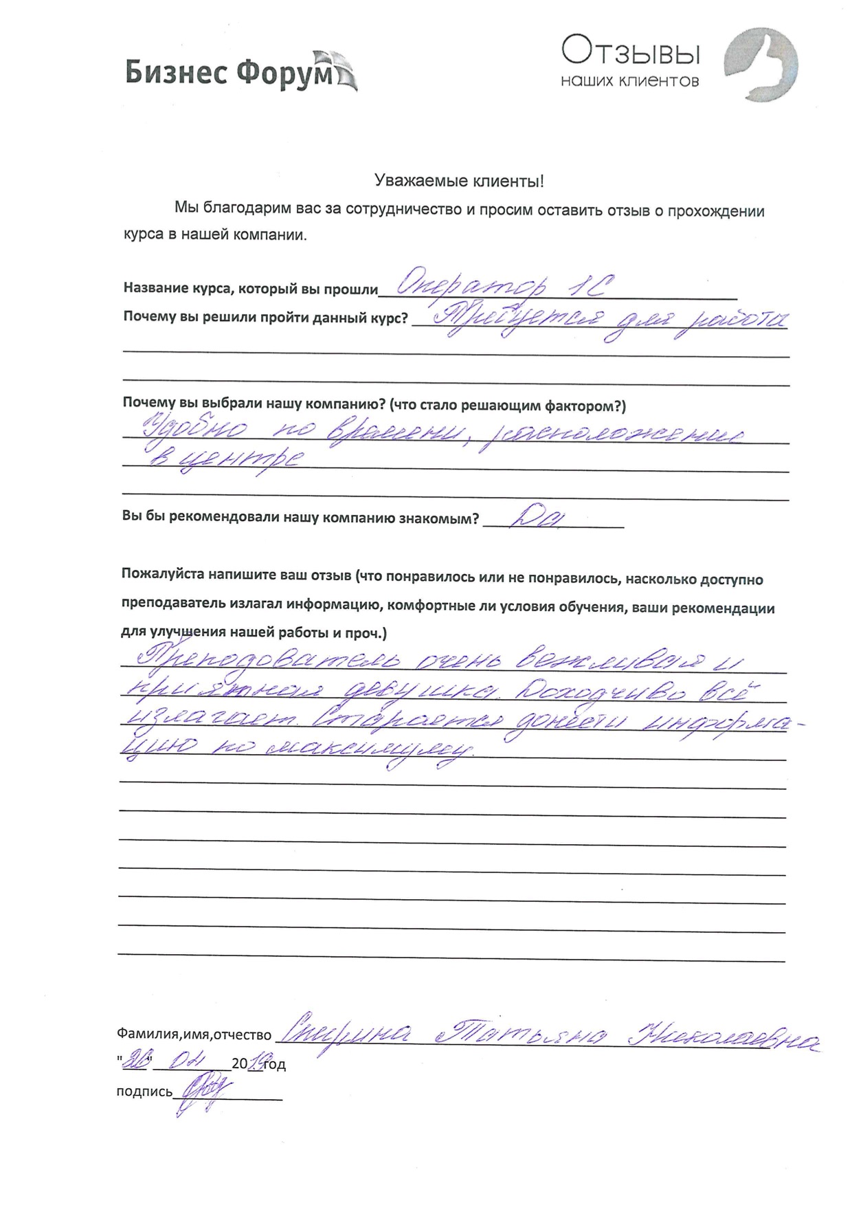Планирую сменить место работы, считаю, что данный курс поможет мне в поиске новой работы. Почитала отзывы , посетивших курсы, на сайте "Бизнес Форум", устроила цена курсов, удобное месторасположения. Во время посещения курсов мне понравилось, сто материал дается в доступной форме, группа обучающихся небольшая, поэтому преподаватель имеет возможность поработать с каждым индивидуально. Обстановка приятная, располагает к общению. Если дополнительно потребуется углубленное знание какой-либо отрасли 1С, обращусь в компанию "Бизнес Форум".