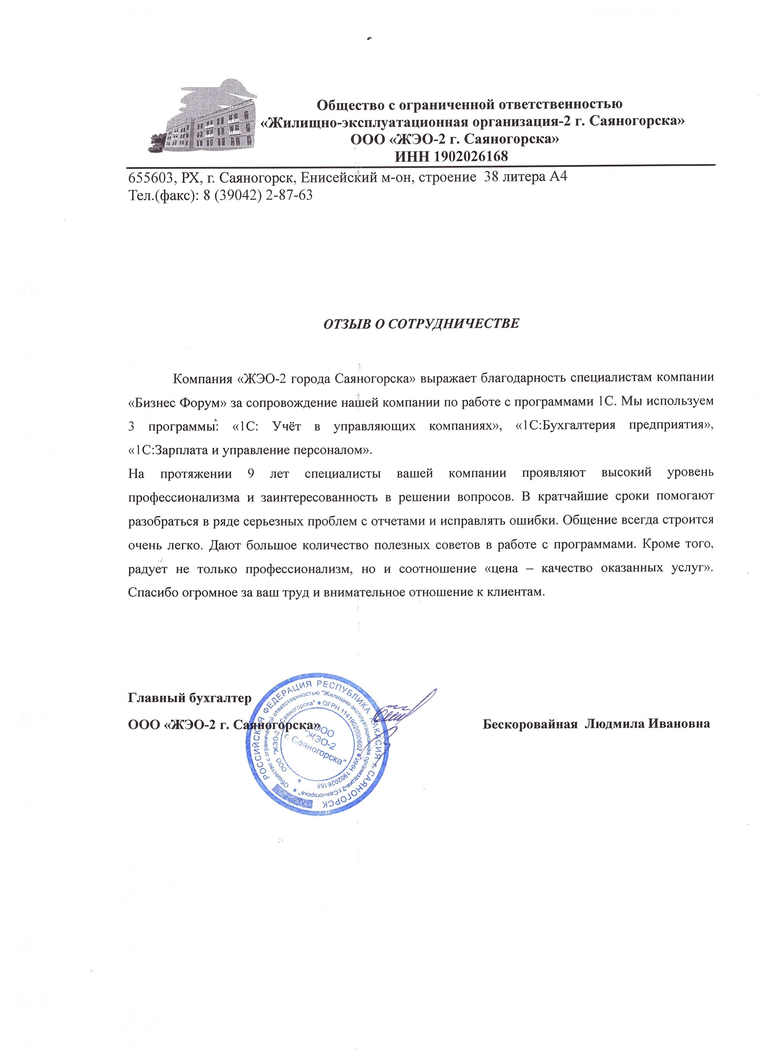 Компания «ЖЭО-2 города Саяногорска» выражает благодарность специалистам компании «Бизнес Форум» за сопровождение нашей компании по работе с программами 1С. Мы используем 3 программы: «1С: Учёт в управляющих компаниях», «1С:Бухгалтерия предприятия», «1С:Зарплата и управление персоналом».